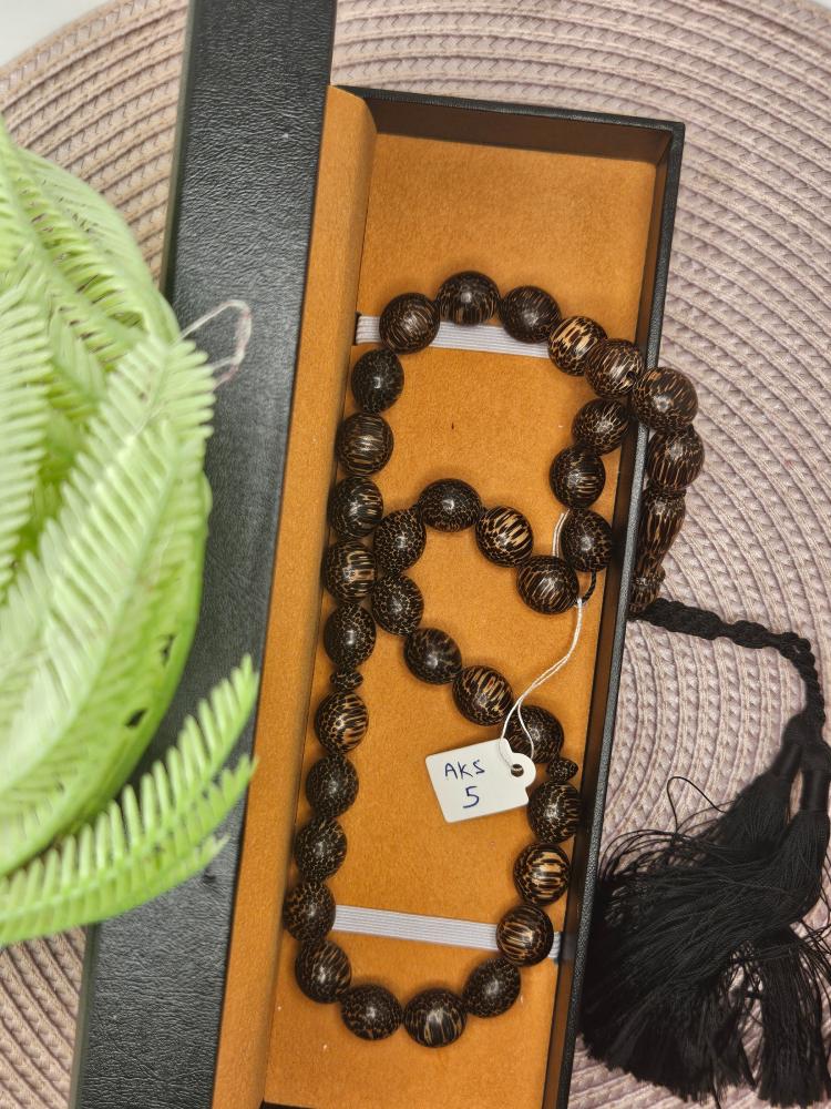 سبحة مميزة مصنوعة من خشب النارجيل الطبيعي (جوز الهند)، تتميز بلونها البني الداكن المائل للأسود مع لمعة خفيفة تمنحها طابعًا أنيقًا وأصيلًا. تمتاز الحبات بصلابتها وخفتها في اليد، مما يجعلها مريحة للاستعمال اليومي ومثالية للتأمل والتسبيح. سبحة خشب النارجيل تحمل لمسة طبيعية فريدة تعكس البساطة والفخامة في آن واحد، وتُعد خيارًا رائعًا للاقتناء أو للإهداء كقطعة ذات قيمة روحانية وجمالية.
