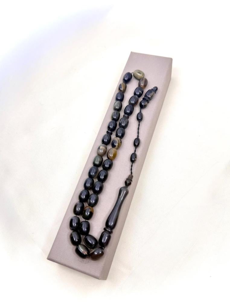 سبحة فاخرة مصنوعة من ظهر السلحفاة الطبيعي، تتميز بلمعانها المميز وألوانها المتداخلة التي تضفي طابعًا تراثيًا أصيلًا، مع نعومة في الملمس وانسيابية في التسبيح، لتجمع بين الجمال والندرة في آن واحد.
