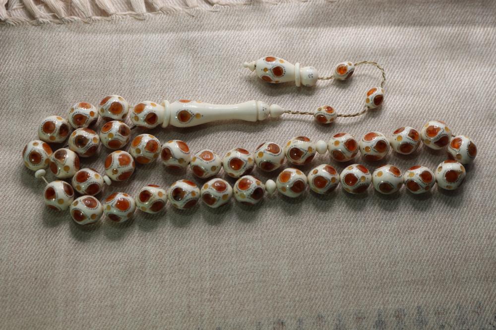 سبحة راقية من عاج ناب الفيل مطعمة بحبات من الكهرمان الطبيعي ولمسات متقنة من الفضة، لتمنحك مزيجًا من الفخامة والأصالة.