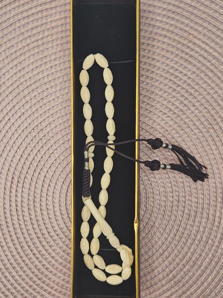 سبحة مميزة مصنوعة من عظم الجمل الطبيعي، تتميز بلونها العاجي الهادئ ولمعانها البسيط الذي يمنحها طابعاً تراثياً أصيلاً. صُنعت بعناية لتجمع بين المتانة والجمال، فتكون رفيقاً أنيقاً للذكر والاقتناء، وخياراً مثالياً لهواة السبح النادرة ذات الطابع الكلاسيكي.