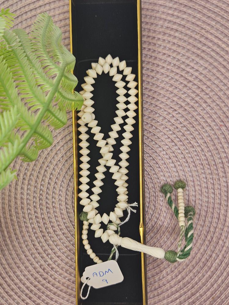 سبحة مميزة مصنوعة من عظم الجمل الطبيعي، تتميز بلونها العاجي الهادئ ولمعانها البسيط الذي يمنحها طابعاً تراثياً أصيلاً. صُنعت بعناية لتجمع بين المتانة والجمال، فتكون رفيقاً أنيقاً للذكر والاقتناء، وخياراً مثالياً لهواة السبح النادرة ذات الطابع الكلاسيكي.