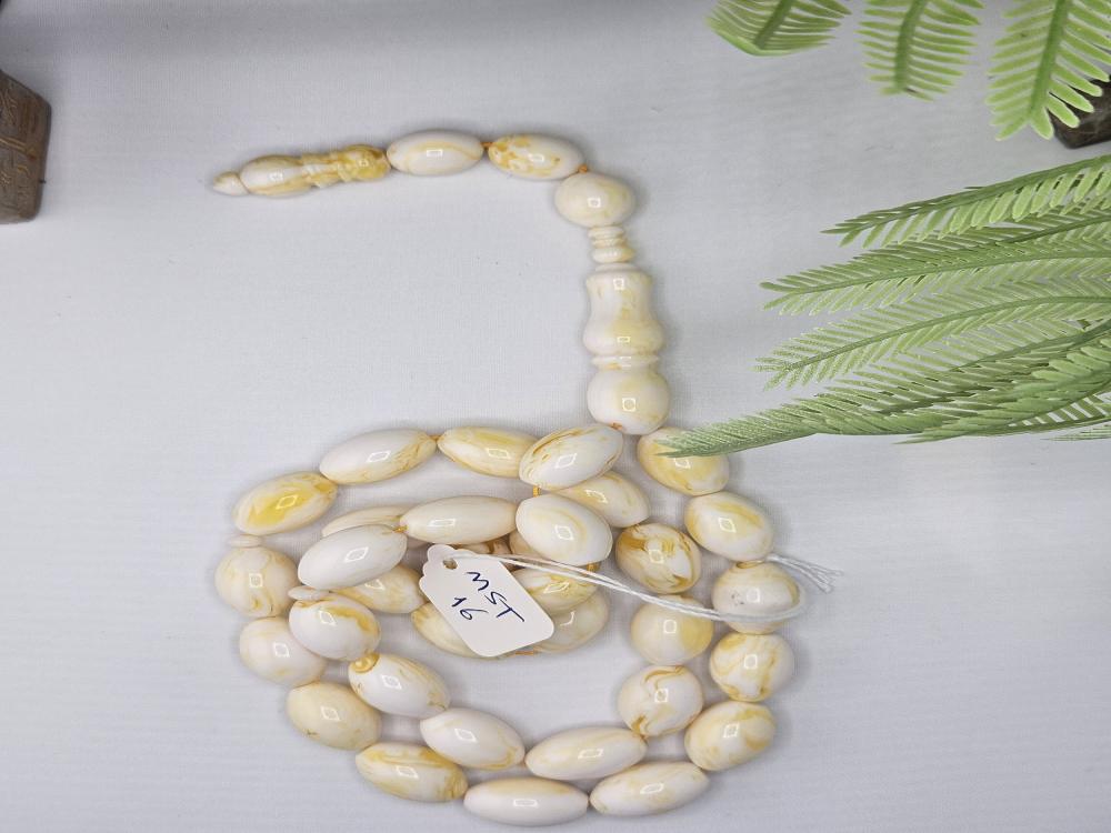 سبحة مصنوعة من المستكة تتميز بفرادة نادرة، فهي تجمع بين الجمال و الاناقة، خرزاتها مصقولة بعناية لتعكس بريقًا هادئًا مع لمسة طبيعية دافئة، تعد خيارًا مميزًا لهواة اقتناء السبح، فهي ليست مجرد أداة للتسبيح فحسب، بل قطعة تحمل طابعًا تراثيًا وروحيًا بلمسة من الفخامة.